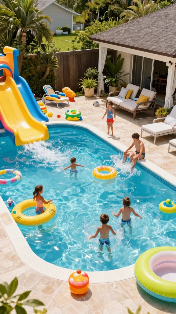 Design a family-friendly pool area that encourages bonding and fun among loved ones. Include features like shallow areas for toddlers, exciting water slides, or even swim-up bars for refreshments. This creates an inviting atmosphere where everyone, from young children to adults, can enjoy their time together.