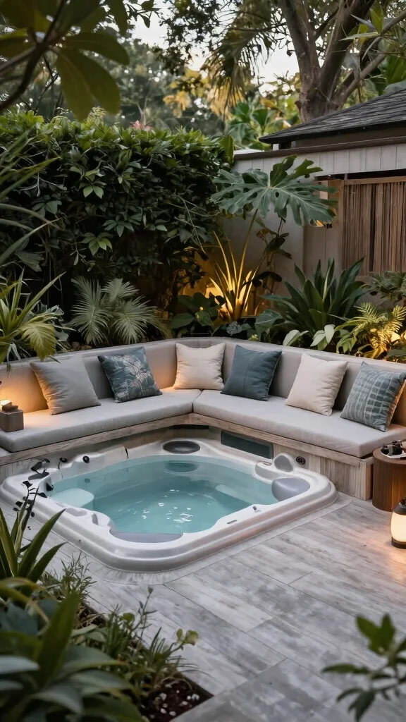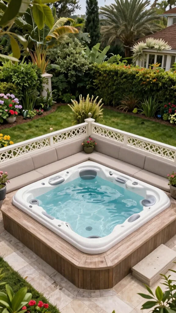 Design built-in seating areas around your hot tub for comfort and relaxation, enhancing your outdoor living experience.