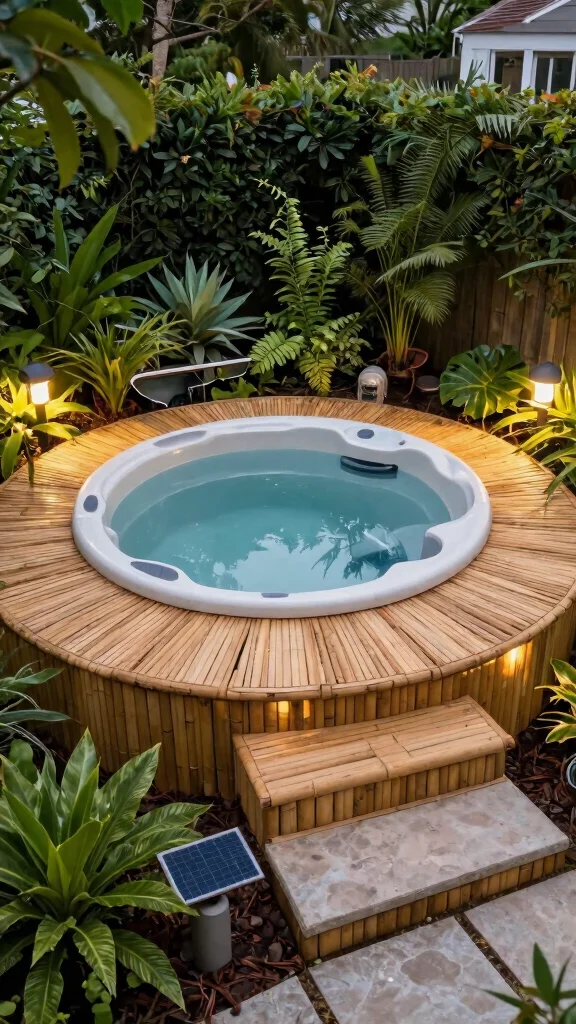 For those who prioritize the environment, an eco-friendly sunken hot tub deck is an excellent choice. Utilize sustainable materials like bamboo for your deck and choose native plants for landscaping to minimize environmental impact. Adding solar lighting ensures the area is illuminated at night while conserving energy.