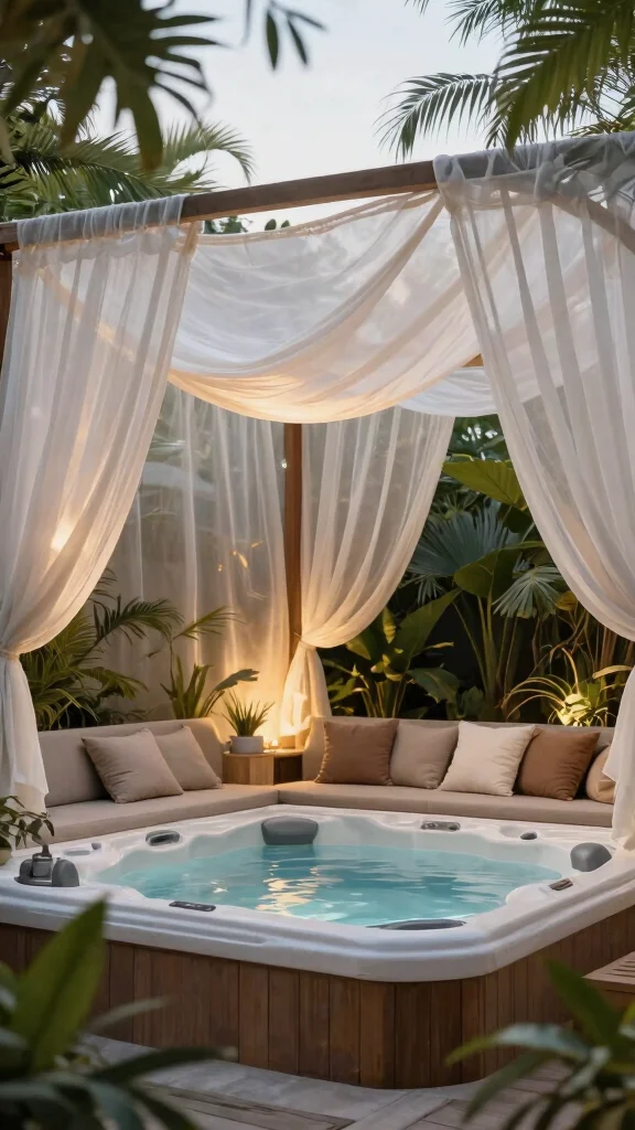 Adding curtains can elevate the luxurious spa experience, while surrounding the area with plants enhances seclusion. This cozy setup becomes a perfect escape from the outside world, ideal for relaxation and unwinding.