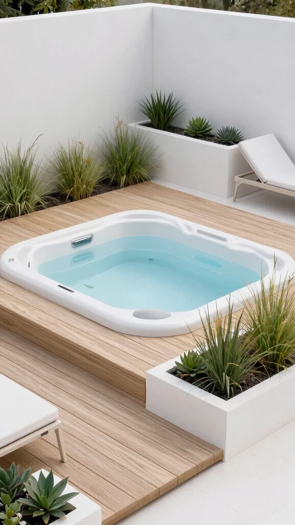 If you appreciate clean lines and a clutter-free environment, a modern minimalist sunken hot tub deck is your ideal choice. The sleek wooden deck merges seamlessly with the hot tub, creating a harmonious flow that’s visually stunning. With fewer distractions, the focus remains on the hot tub itself, allowing it to shine as the centerpiece of your outdoor space. You can introduce geometric planters filled with succulents and ornamental grasses to add a touch of life without overwhelming the design.