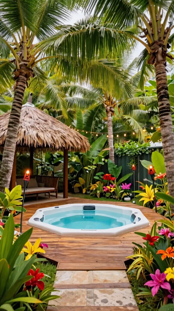 Transform your outdoor space into a tropical paradise with a sunken hot tub deck that radiates warmth and relaxation. By surrounding the hot tub with lush palm trees, vibrant flowers, and exotic plants, you can create an inviting retreat that feels like a vacation destination right at home. A wooden deck paired with a thatched-roof gazebo provides a perfect shaded spot to unwind. Consider adding tiki torches or string lights to set the mood for evening gatherings.