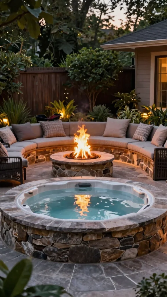 Position a fire pit near your hot tub for added warmth and ambiance, perfect for chilly evenings.