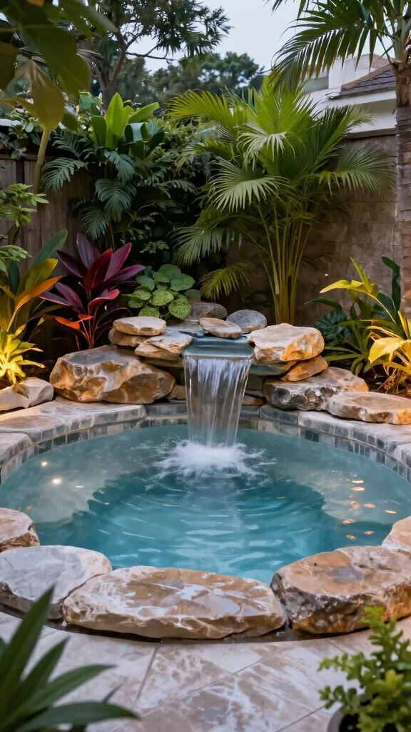 Introduce a waterfall feature for soothing sounds and a stunning visual element to your sunken hot tub space.