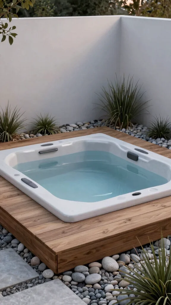 If you cherish simplicity and elegance, the elegant minimalist sunken hot tub is your ideal match. This design showcases sleek lines and an understated aesthetic, featuring a rectangular hot tub that seamlessly integrates into a wooden or stone deck. Surrounding it with a few carefully placed boulders and easy-care plants creates a chic atmosphere that feels effortlessly stylish.To elevate this look, opt for natural materials such as wood and stone for your deck. Incorporate low-maintenance plants like succulents or ornamental grasses for a touch of life without the fuss. This serene setting invites you to unwind and appreciate the natural beauty surrounding you.Key Tips: