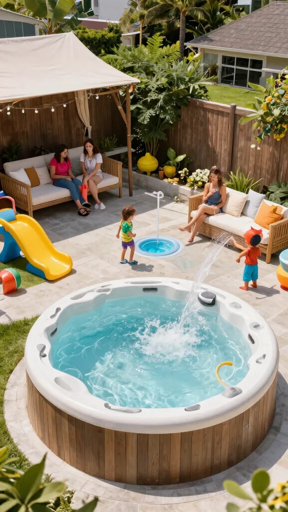 Transform your backyard into a family-friendly haven with a sunken hot tub designed for all ages. Incorporate safety features like rounded edges, non-slip surfaces, and built-in seating to ensure children can enjoy it too. Surround the hot tub with playful elements like a splash pad or outdoor games, along with a cozy seating area for parents to supervise.This design prioritizes fun for everyone, ensuring kids and adults can enjoy quality time together. Adding a shaded area with umbrellas or a gazebo keeps the space comfortable during hot summer days.Key Tips: