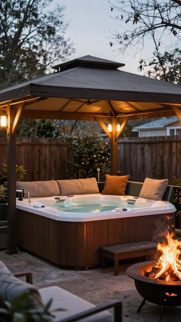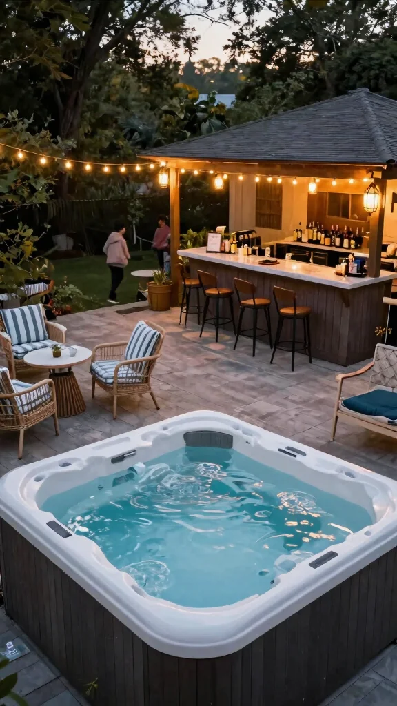 Transform your backyard into a lively social hub with a sunken hot tub designed for entertaining. Incorporate a bar area or grill nearby for seamless outdoor gatherings. Stylish outdoor furniture surrounding the hot tub ensures guests can lounge comfortably while socializing.Enhance the festive vibe with string lights or lanterns that provide a warm glow during evening events. Make sure your hot tub is easily accessible for guests, fostering a space that encourages social interaction and enjoyment.Key Tips: