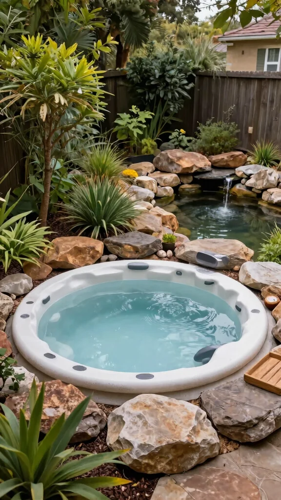 Think about natural stone coping, timber decking, poured concrete, or ceramic tile around the edge, with matching edging to tie into the yard. Pair the tub with low-maintenance shrubs and grasses that won’t overwhelm the space. Add built-in planters and subtle lighting to highlight the water while preserving the overall garden features and landscape design for outdoor living.