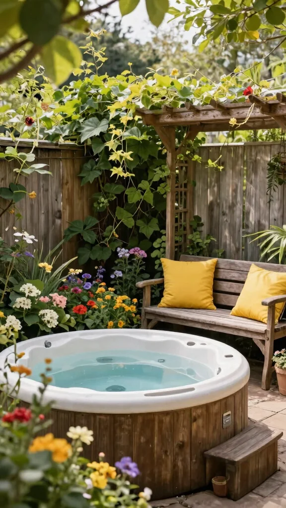 Create a cottage retreat by letting your sunken hot tub blend with nature—surround it with hydrangeas, climbing vines, and a trellis for instant privacy. Add rustic benches nearby for easy gathering, so conversations bloom just as much as the garden.