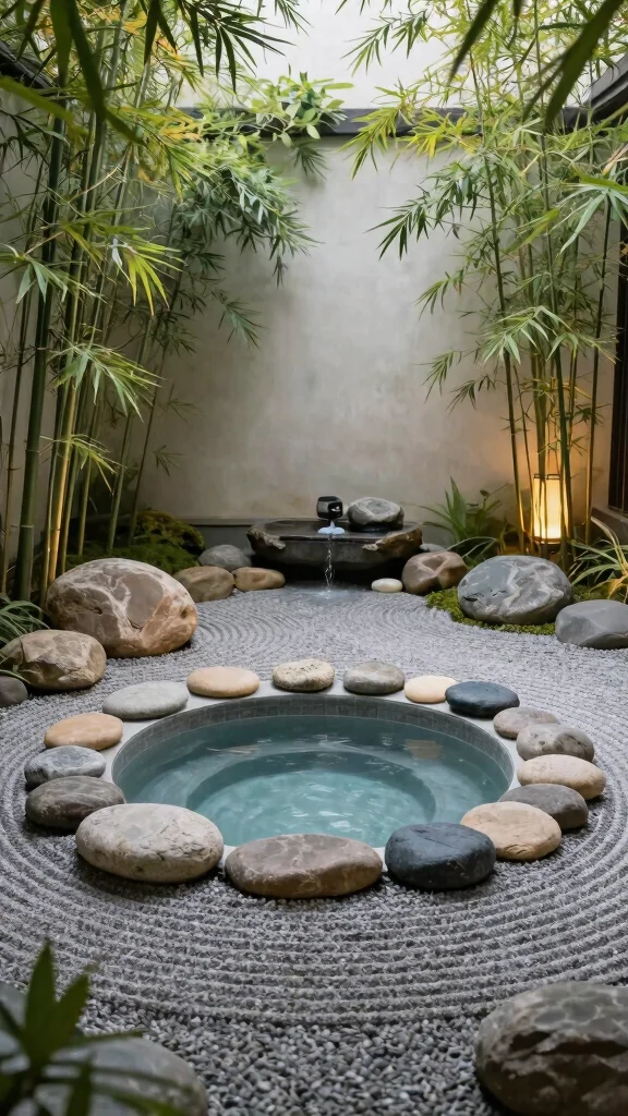 Transform your space into a peaceful sanctuary with a sunken hot tub designed for relaxation and mindfulness. Inspired by Japanese Zen gardens, this design features elements like bamboo, smooth stones, and calming water features. A hot tub set at the center of a stone path, surrounded by raked gravel and thoughtfully placed boulders, creates a tranquil atmosphere.Enhance this serene environment with calming features like a bamboo fence, a small Japanese lantern, or a gentle water fountain. This tranquil setting is perfect for meditation or a quiet soak after a long day. Soft ambient lighting can enhance the soothing vibe during evenings.Key Tips: