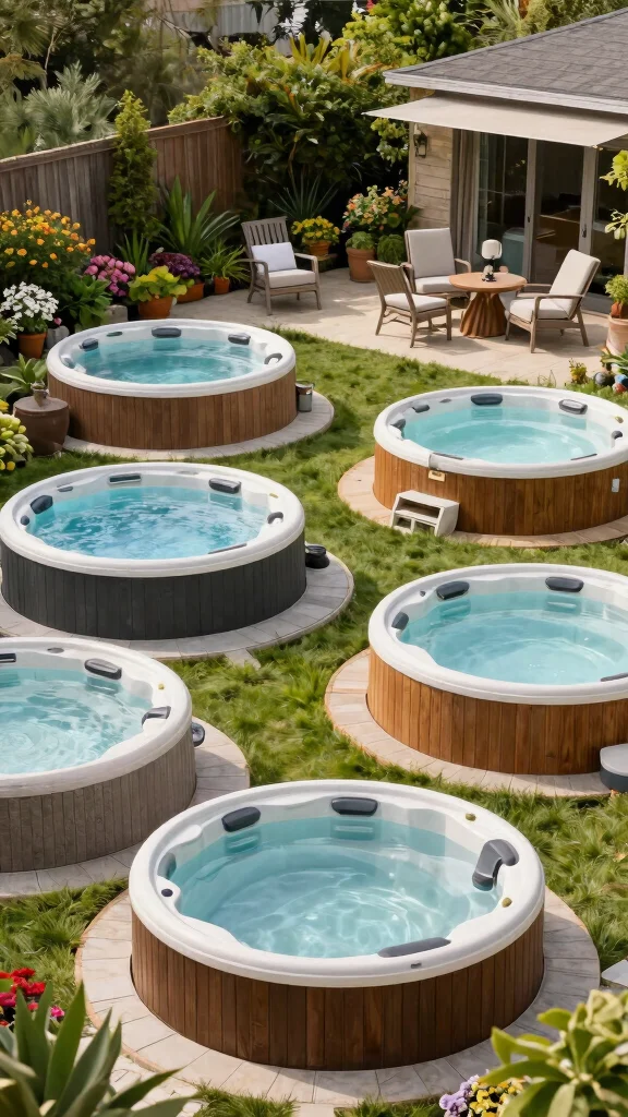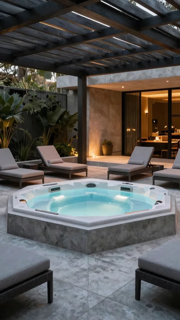 If you envision a luxurious spa experience at home, a modern luxury sunken hot tub is the perfect choice. This design often showcases sleek geometric shapes and is crafted from materials like concrete or fiberglass, providing a contemporary look. Surrounding features may include stylish outdoor furniture, a chic pergola, or even a mini bar for entertaining guests.To capture this luxurious feel, invest in plush lounge chairs and upscale outdoor decor that complements your hot tub. Adding a built-in sound system or LED lighting can elevate the entire experience. This design ensures that every soak feels like a mini getaway.Key Tips: