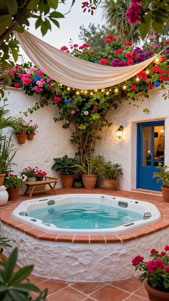Transport yourself to the Mediterranean with a sunken hot tub that embodies the region’s vibrant colors and relaxed ambiance. Incorporate terracotta tiles, white stucco walls, and lush greenery to create a picturesque setting. Fragrant citrus trees and colorful flowers surrounding your hot tub enhance the vacation vibe.This design celebrates open spaces and bright hues, making it perfect for outdoor entertaining. Consider adding a shaded area with draped fabrics to protect against the sun, enhancing the overall Mediterranean atmosphere.Key Tips: