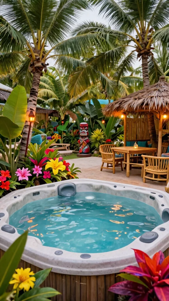 Create a tropical paradise with a sunken hot tub that transports you to an island retreat. Surround the hot tub with palm trees, exotic plants, and vivid flowers to evoke a vacation mood every time you step outside. A wooden deck or thatched roof adds an extra layer of tropical flair.Incorporate elements like tiki torches or bamboo furniture to enhance the festive atmosphere, making it ideal for backyard gatherings. This design is all about vibrant colors, lush textures, and a sense of escapism.Key Tips: