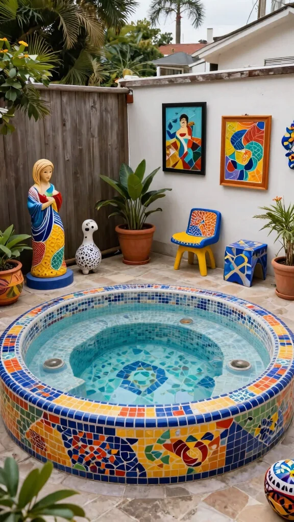 Unleash your creativity with a sunken hot tub that features a stunning mosaic design. By using colorful tiles or stones, you can craft unique patterns that reflect your personality. This artistic approach provides a truly personalized touch that becomes a conversation starter for your guests.Surround the hot tub with complementary elements like artistic sculptures or unique outdoor art pieces that harmonize with the mosaic. This design is perfect for those who enjoy showcasing their individuality and appreciating craftsmanship.Key Tips:
