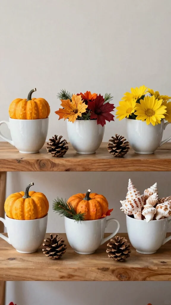 This idea adds a personal touch to your decor while reflecting your style and the beauty of each season. Arrange the teacups beautifully on tables, windowsills, or shelves to bring seasonal cheer into your living space.