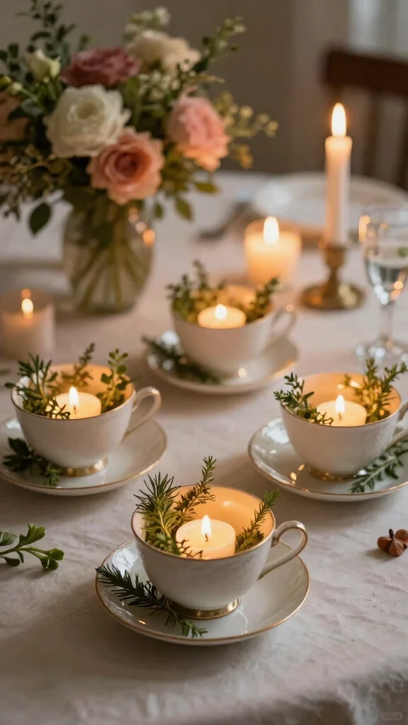 Start by filling your teacups with soil and planting herbs, then place a small candle in the center. When lit, these teacup candle holders cast a soft, inviting glow, perfect for evening gatherings or a romantic dinner.