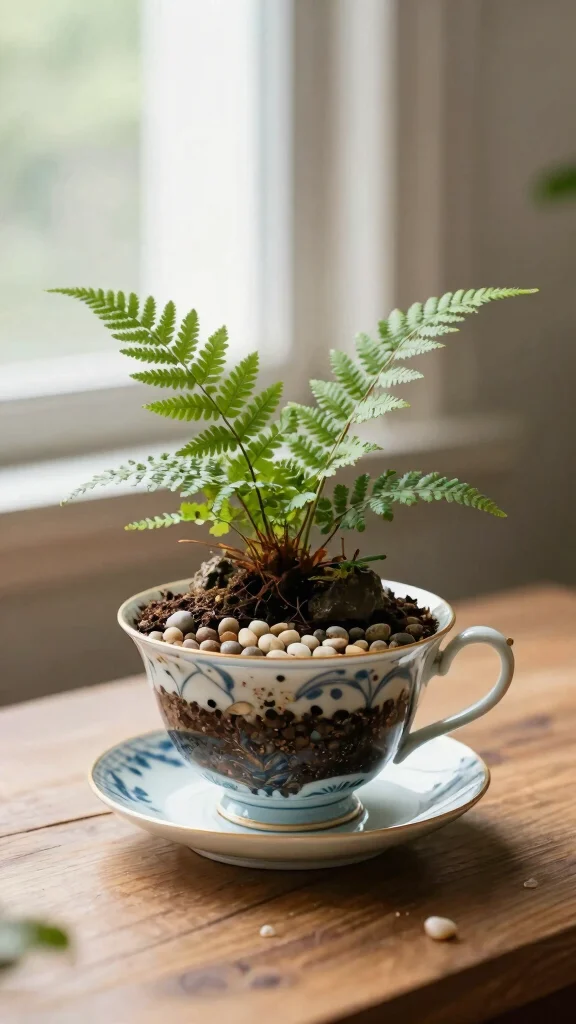 Fun fact: a teacup terrarium can sustain a tiny ecosystem with just 1 layer of gravel, soil, and moss. Keep humidity around 60-70% and water sparingly every 2-3 weeks for thriving greenery.