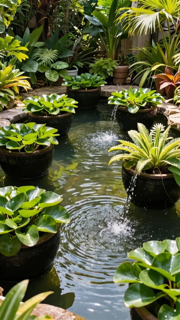 Surrounding your pond or fountain with potted tropical plants creates a lush oasis feel that invites tranquility. This harmonious blend of elements enhances the overall beauty of your outdoor space.