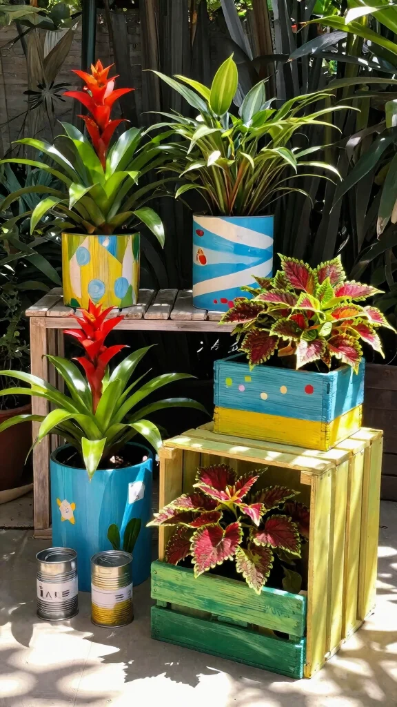 Fill your upcycled planters with vibrant tropical plants like Bromeliads or Coleus, which thrive in various conditions. Brightly painting these containers or adding fun patterns can enhance their appeal and make them eye-catching focal points in your backyard.