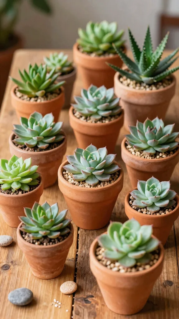 Succulents are low-maintenance, allowing you to enjoy their beauty without much effort. Group several terracotta pots together on a charming plant stand or rustic table to craft an inviting display that draws in guests.