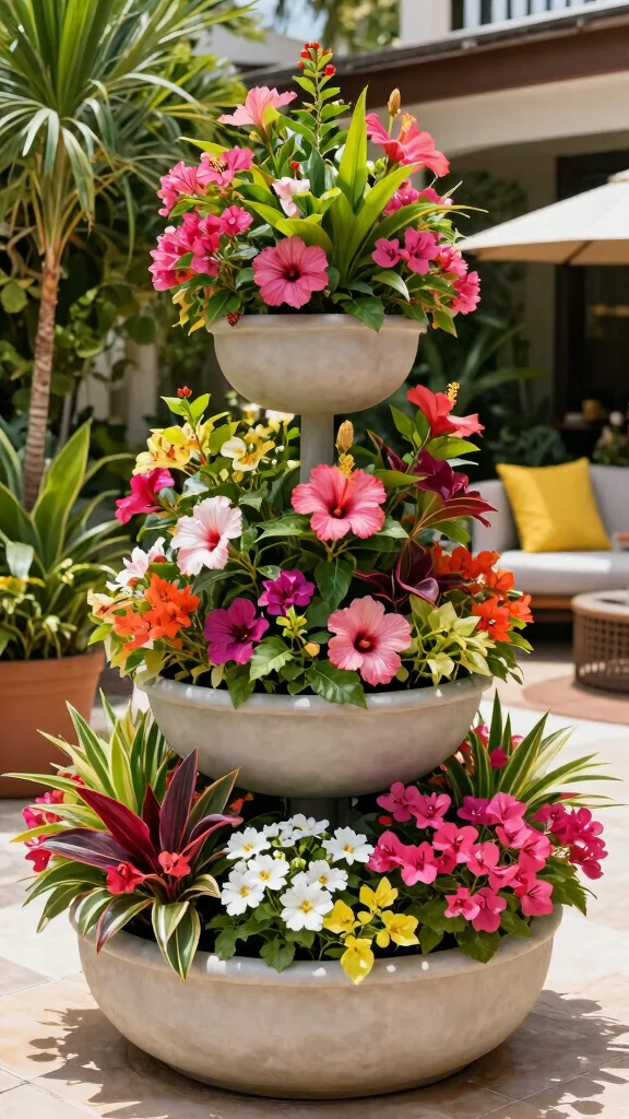 Transform your tropical garden with tiered planters, ideal for showcasing a variety of colorful blooms like Hibiscus or Bougainvillea. These multi-level planters not only provide visual appeal but also make the most of limited space, drawing the eye upward to create a vibrant display.