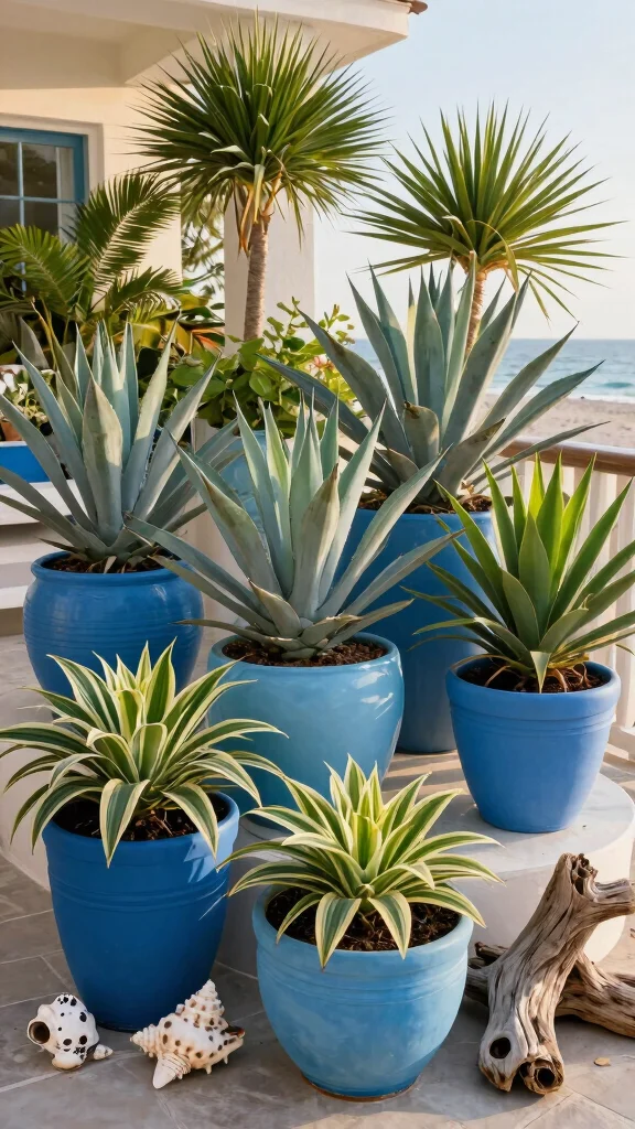 Capture coastal vibes with blue-toned planters that evoke images of the ocean. Pair these charming pots with tropical plants like Blue Agave or Variegated Dracaena for a refreshing look that promotes serenity. The contrast of blue pots against vibrant greens fosters a tranquil atmosphere, ideal for unwinding.