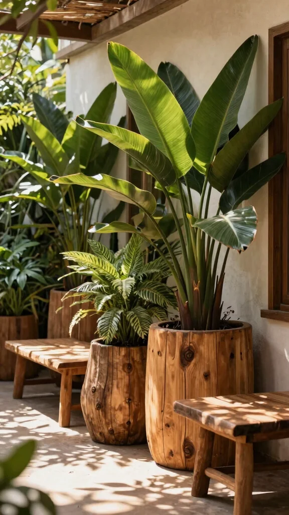 Introduce a touch of rustic charm to your patio with wooden planters, perfect for a tropical setting. Consider DIY projects using reclaimed wood for a sustainable option that looks fantastic. Fill these planters with lush tropical plants like Calatheas or Bird of Paradise for an inviting effect.