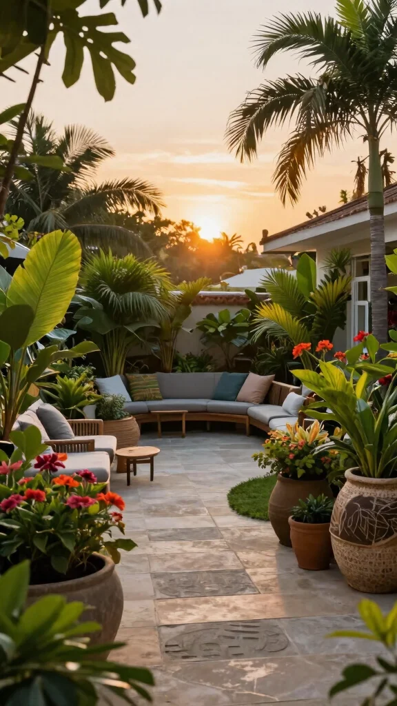 Place fragrant tropical plants near seating for sensory appeal and consider a subtle water feature or lighting to enhance the backyard oasis vibe after dark. With smart spacing and repeating design elements, you can enjoy resort-worthy charm in any patio or backyard, even in a small space.