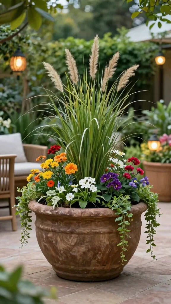 Want to create a stunning centerpiece in your garden? Use a large rustic trough planter as a focal point! Position it in the center of a seating area or at the garden’s entrance. Fill it with a mix of tall ornamental grasses, colorful flowers, and trailing plants for a captivating look.