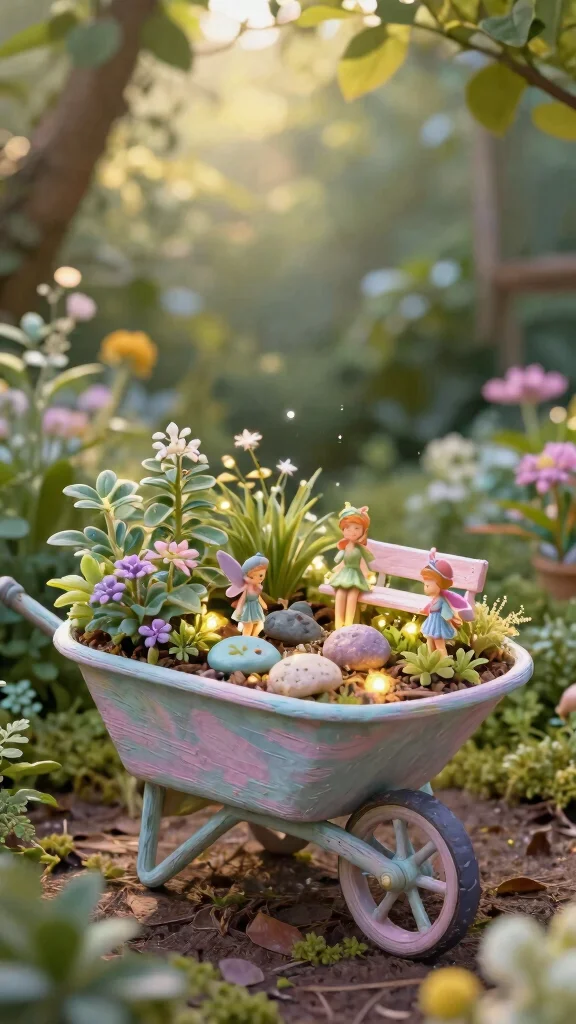 Transform an old wheelbarrow into a whimsical fairy garden with miniature plants and decorations for a magical touch.