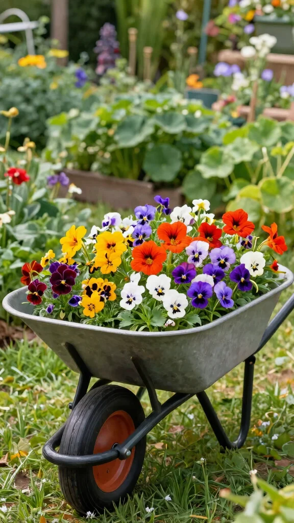 Plant edible flowers in your wheelbarrow for a beautiful and functional addition to your garden, perfect for culinary use.