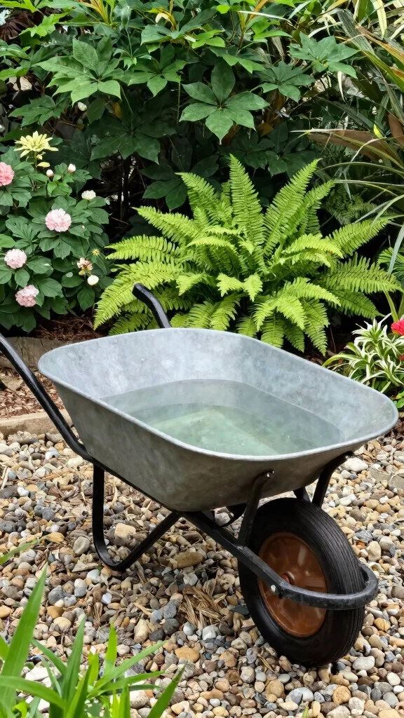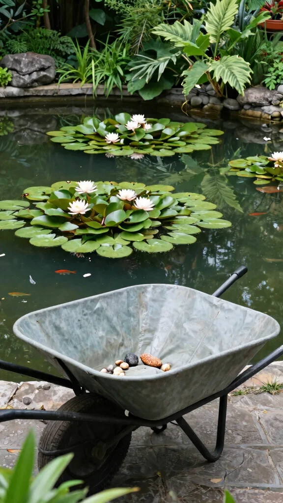 Convert a wheelbarrow into a small pond, adding water plants and decor for a serene garden oasis.