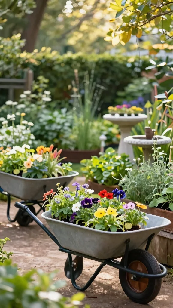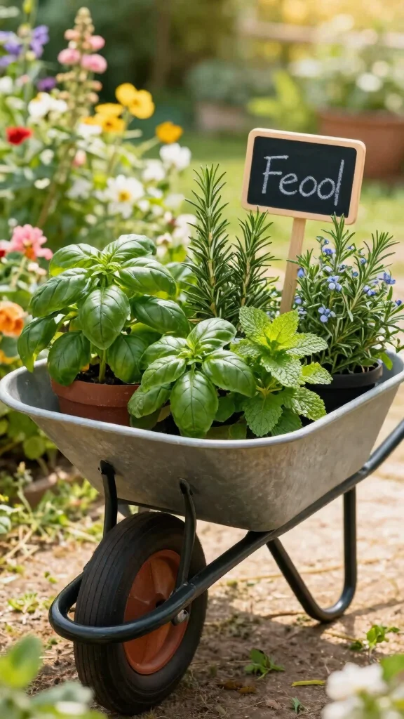 Utilize a wheelbarrow to plant herbs, allowing easy access for cooking while adding rustic charm to your garden.