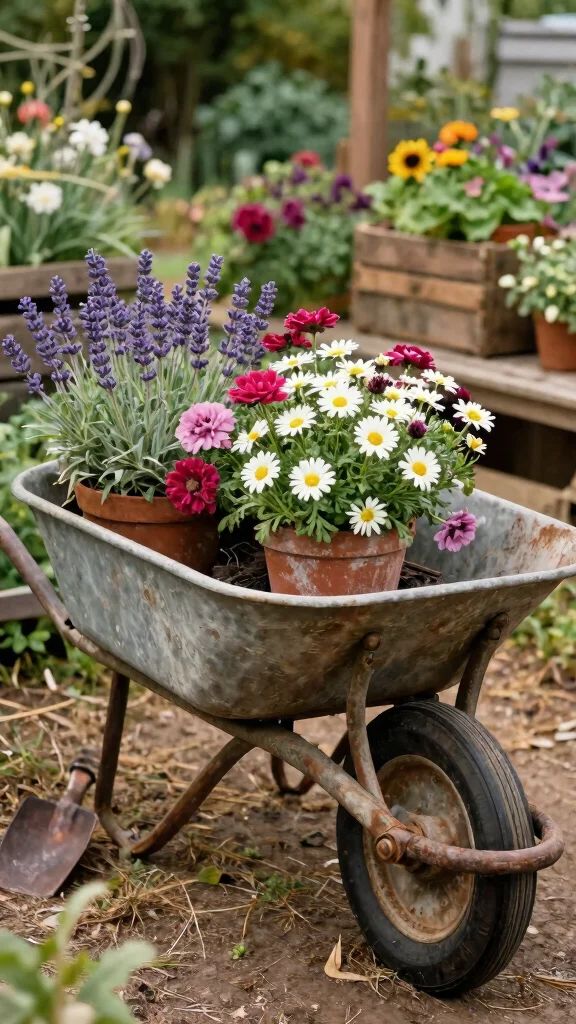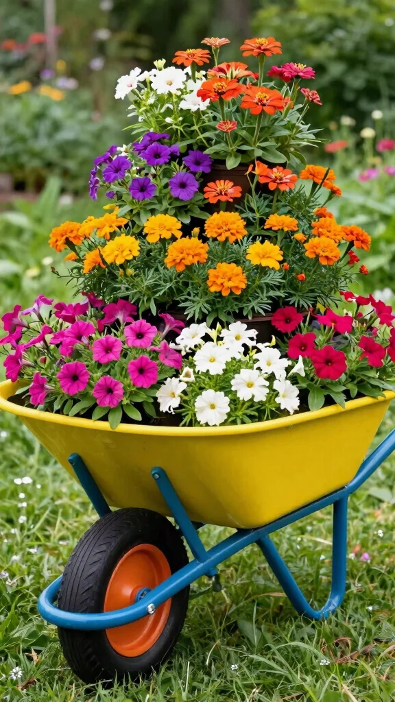 Mix annuals like petunias, marigolds, and zinnias for a continuous bloom throughout the season. Group the flowers by height to create a captivating tiered effect, placing taller blooms in the back and shorter ones in the front. Painting the wheelbarrow in a contrasting color will make the flowers pop beautifully. This eye-catching display will brighten any corner of your garden.