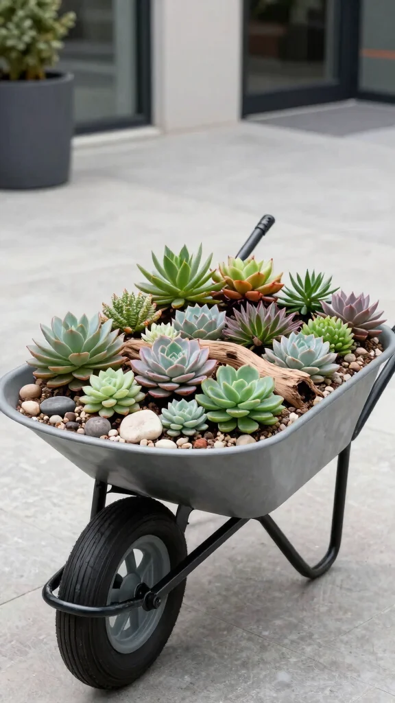 These hardy plants come in various shapes and colors, making them ideal for creating a unique display. Arrange taller succulents in the back and trailing varieties in the front for a layered effect. You can add decorative stones or driftwood for extra texture. A succulent wheelbarrow is a low-maintenance choice that brings charm to both indoor and outdoor spaces.