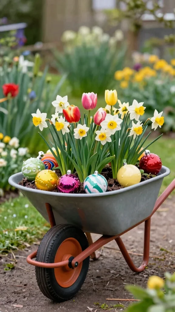 Rotate seasonal decorations and plants in your wheelbarrow for festive displays throughout the year, keeping your garden lively.