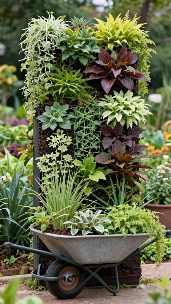 Transform your wheelbarrow into a vertical garden to maximize space and showcase diverse plants.