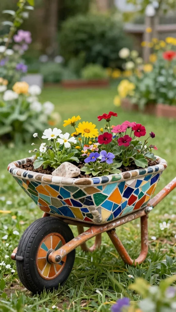 Incorporate mosaics or painted designs on your wheelbarrow planter for a creative and personalized garden display.
