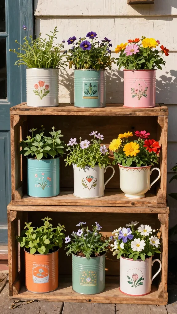 – Upcycled containers (tin cans, crates, teacups)