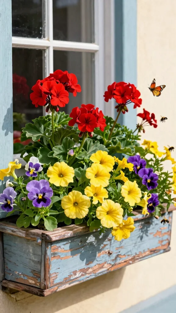 Turn your window planter boxes into a cottage-worthy burst of color with geraniums, petunias, and pansies. Layer taller blooms at the back and trailing ones at the front to lure butterflies and bees and boost curb appeal. A quick, minutes-to-plant swap that looks timeless.