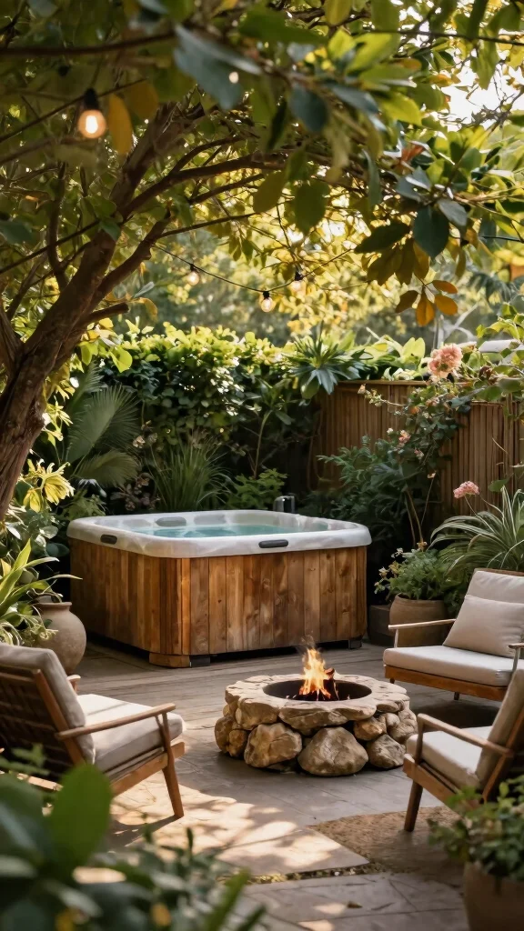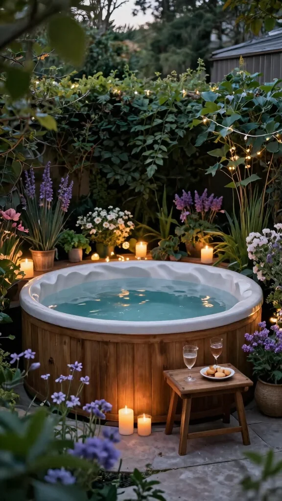 To elevate this cozy retreat, add whimsical string lights that twinkle at night and a small fire pit nearby for those cooler evenings. Using natural stones around the tub can help it blend beautifully with your garden, making it feel like a secret haven.
