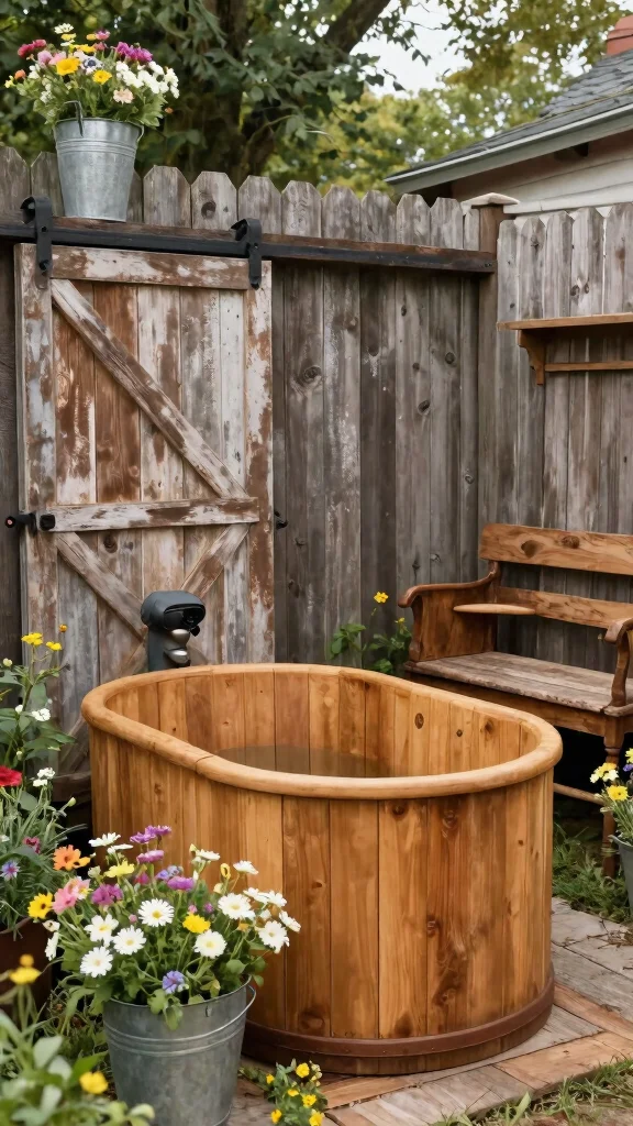 Enhance this nostalgic atmosphere by incorporating reclaimed barn doors or antique furniture nearby. Surround your hot tub with wildflowers and tall grasses for an authentic rural touch that invites tranquility.