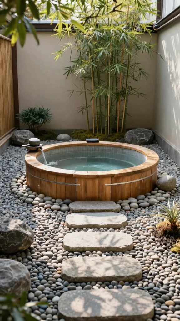 Incorporating bamboo elements for fencing or as landscaping can enhance the serene, Asian-inspired aesthetic. A pathway of stepping stones leading to the hot tub adds a calming touch to your journey.