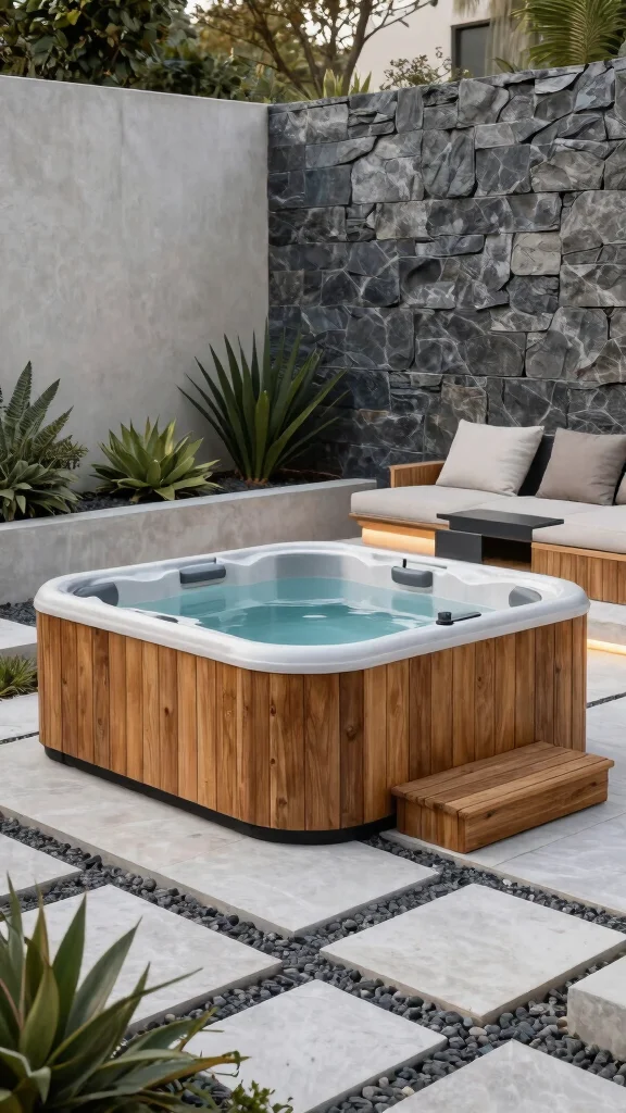 Merge modern design with rustic charm in your wooden hot tub setup. A sleek, angular hot tub made of rich wood adds a contemporary twist while maintaining warmth. Pair it with minimalist furnishings and bold geometric landscaping for a fresh look.