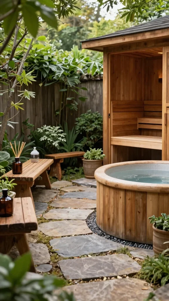 Turn your garden into a rustic spa experience with a wooden hot tub that seamlessly blends with nature. Incorporate natural elements like stone pathways, wooden benches, and lush greenery to evoke a sense of tranquility. Adding features like a sauna or steam room nearby enhances the overall spa-like ambiance.